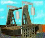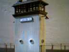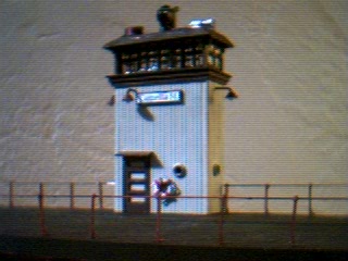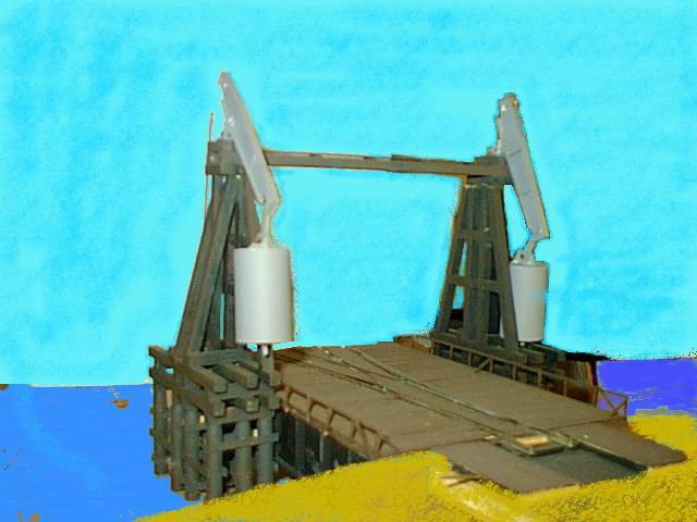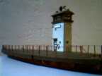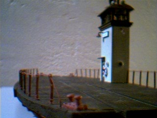 HO scale model of railroad carferry dock showing right side. Model was dropped so there are some broken or bent parts.