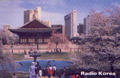 Radio Korea heard April, 1989. Card is titled "Cherry blossoms in full